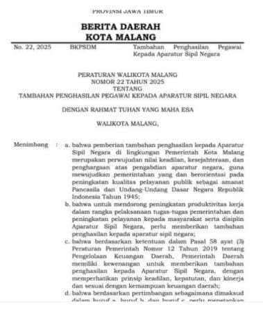 Malangkota//mediasiberkompppak.com- Kebijakan pemotongan Tunjangan Kinerja Pegawai (TPP) bagi Aparatur Sipil Negara (ASN) di lingkungan Pemerintah Kota Malang yang menerapkan skema berbeda berdasarkan masa kerja kini menjadi sorotan tajam dari publik dan kalangan pegawai.